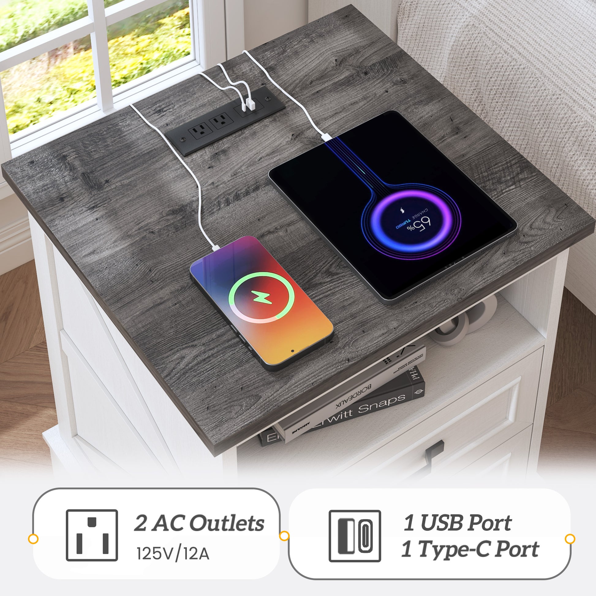 Fluest 24” Tall Farmhouse Nightstands, Night Stands with Charging Station, Beside Tables with Drawers and Open Storage, Rustic End Tables for Bedroom, Antique White/Black
