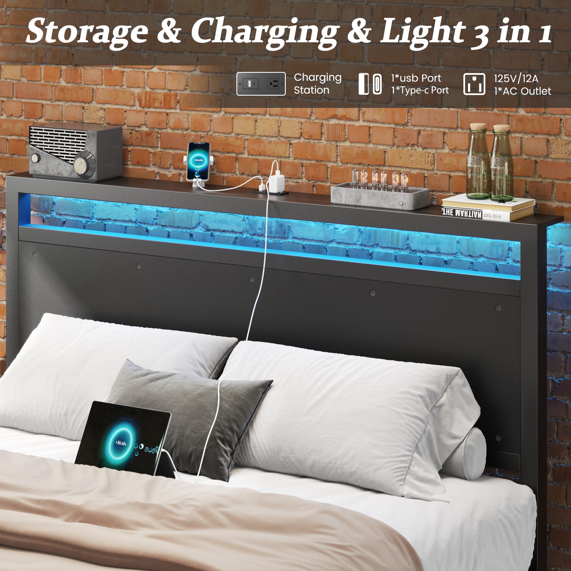 - INTEGRATED CHARGING STATION: Stay charged without leaving bed! Features a built-in hub with 1 AC outlet, 1 USB-A port, and 1 USB-C port for all your devices.
