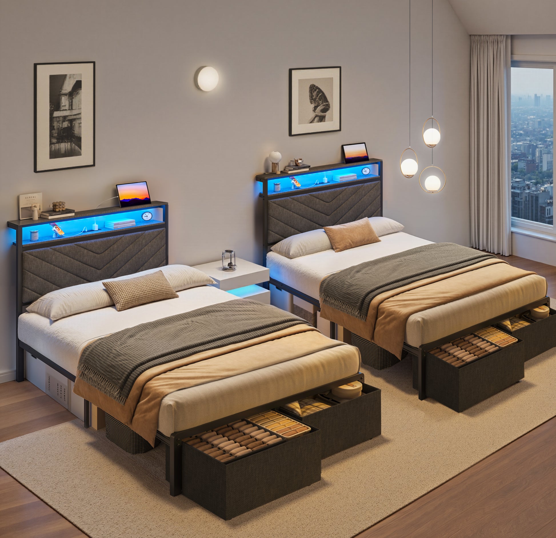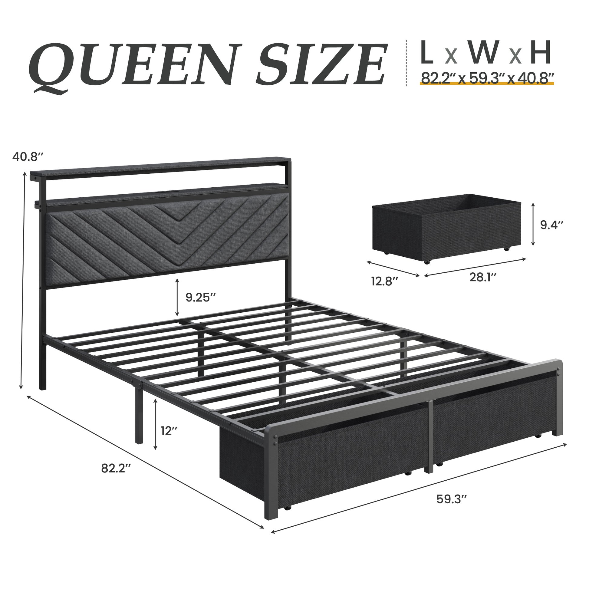 Fluest Queen Bed Frame wit Storage Drawers, Upholstered Headboard with Charging Station, LED Lights, Fabric Drawers with Wheels, Under Bed Storage, No Box Spring Needed, Easy Assembly, Grey