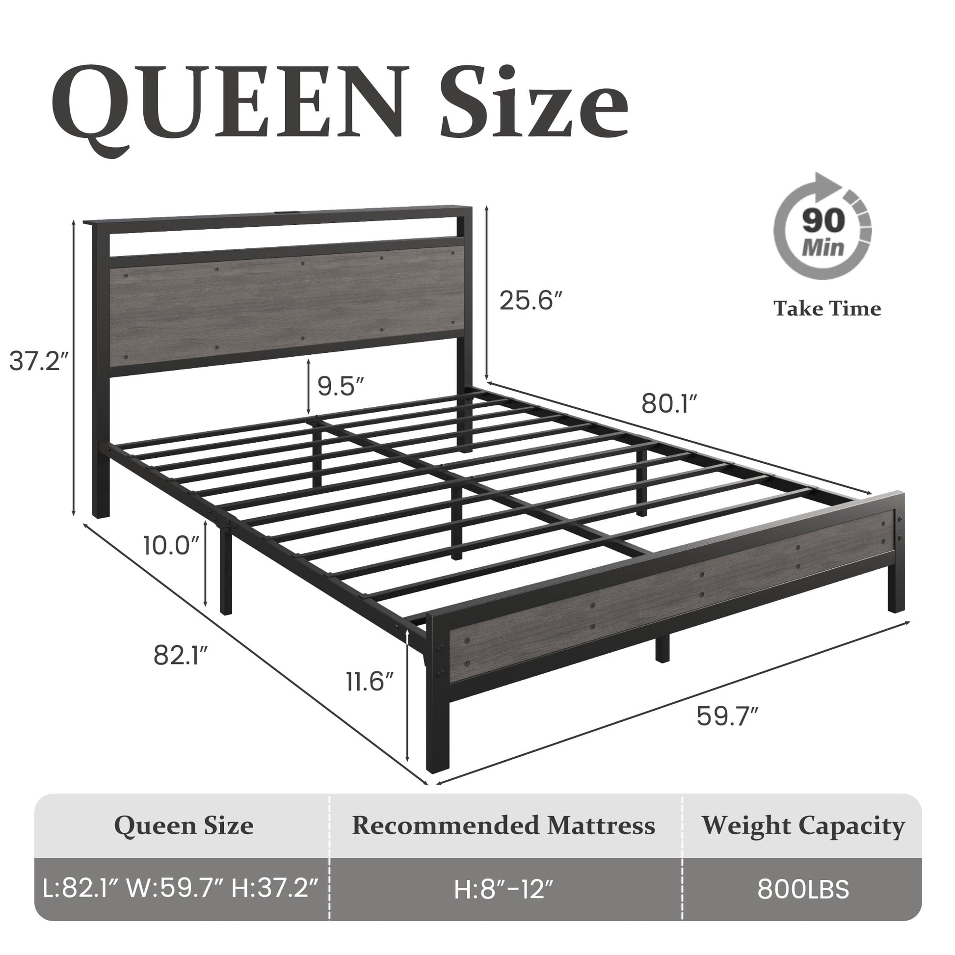 Fluest Queen Bed Frame with LED Headboard & Charging Station, Noise-Free, No Box Spring Needed, Rustic Grey