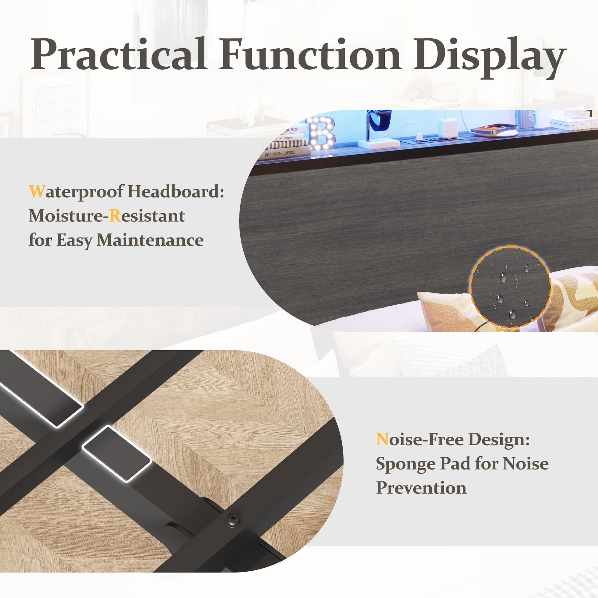 - Features a two-tier storage headboard.