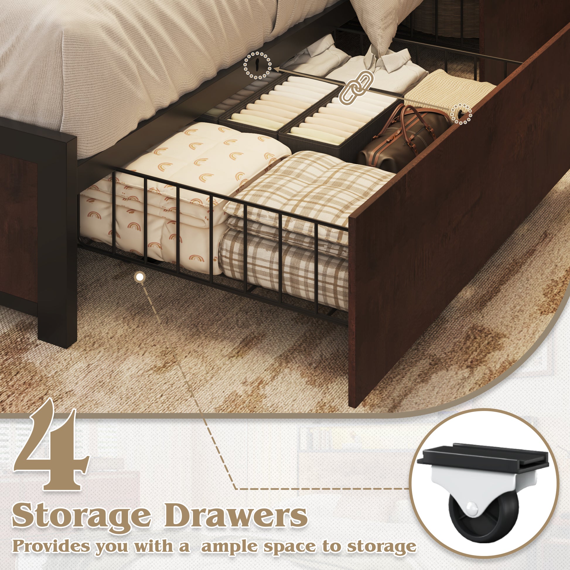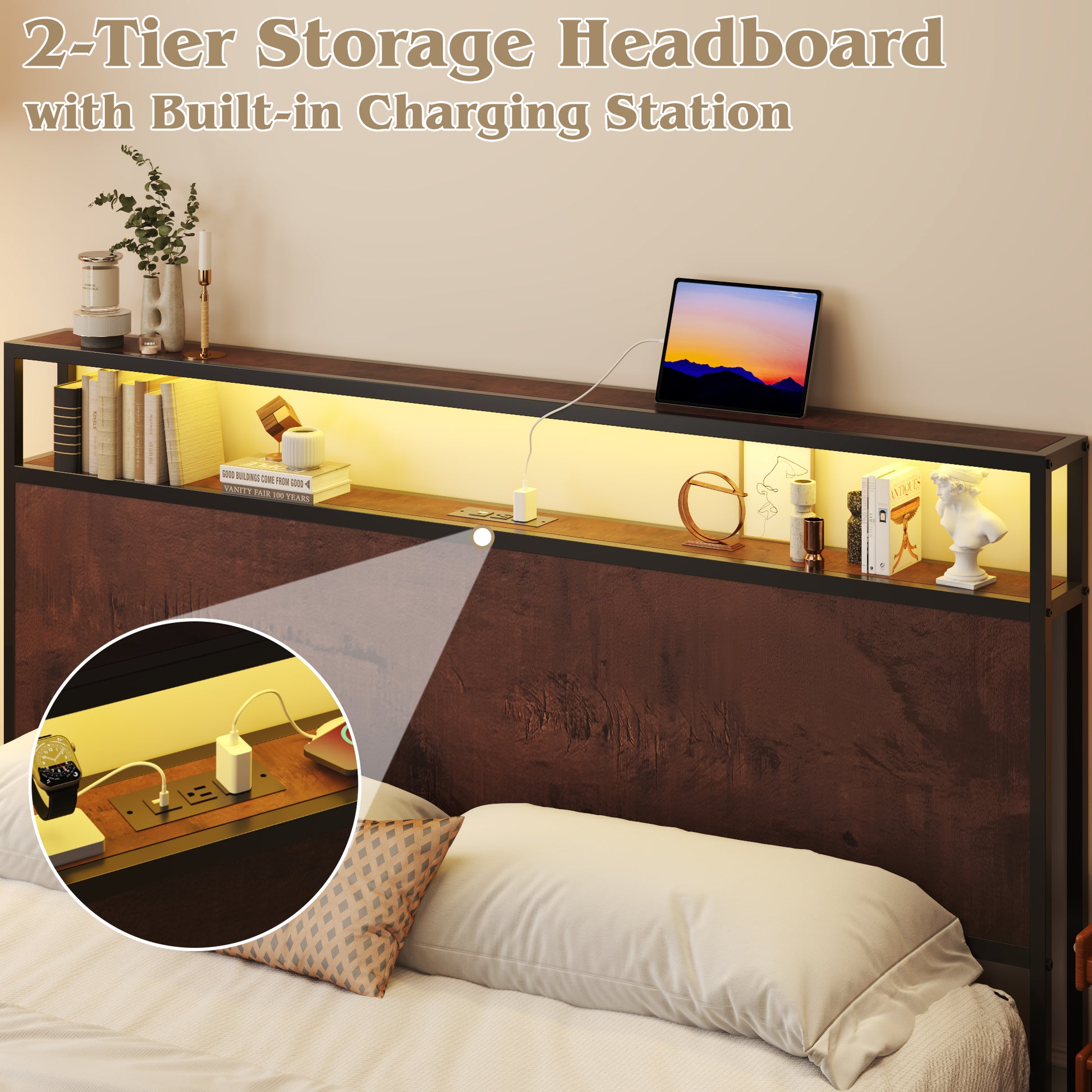 Metal Platform Bed Frame with 2-Tier Headboard,Queen,USB Port & LED Light, 4 Storage Drawers, No Box Spring Needed, Noise Free, Rustic Brown