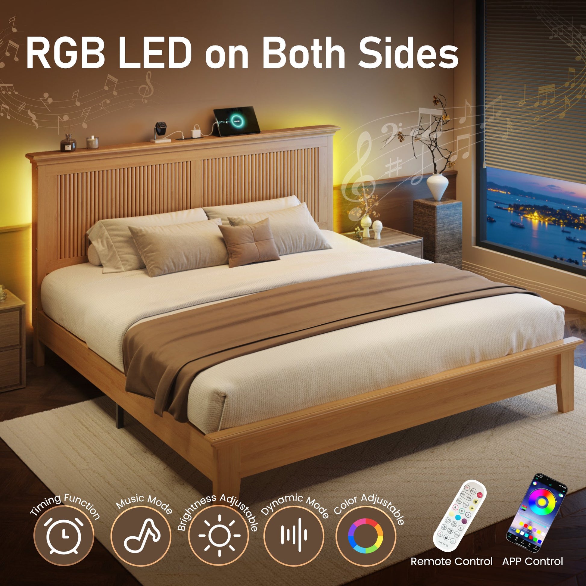 Solid Wood High Headboard and Charging Station Bed Frame, Queen